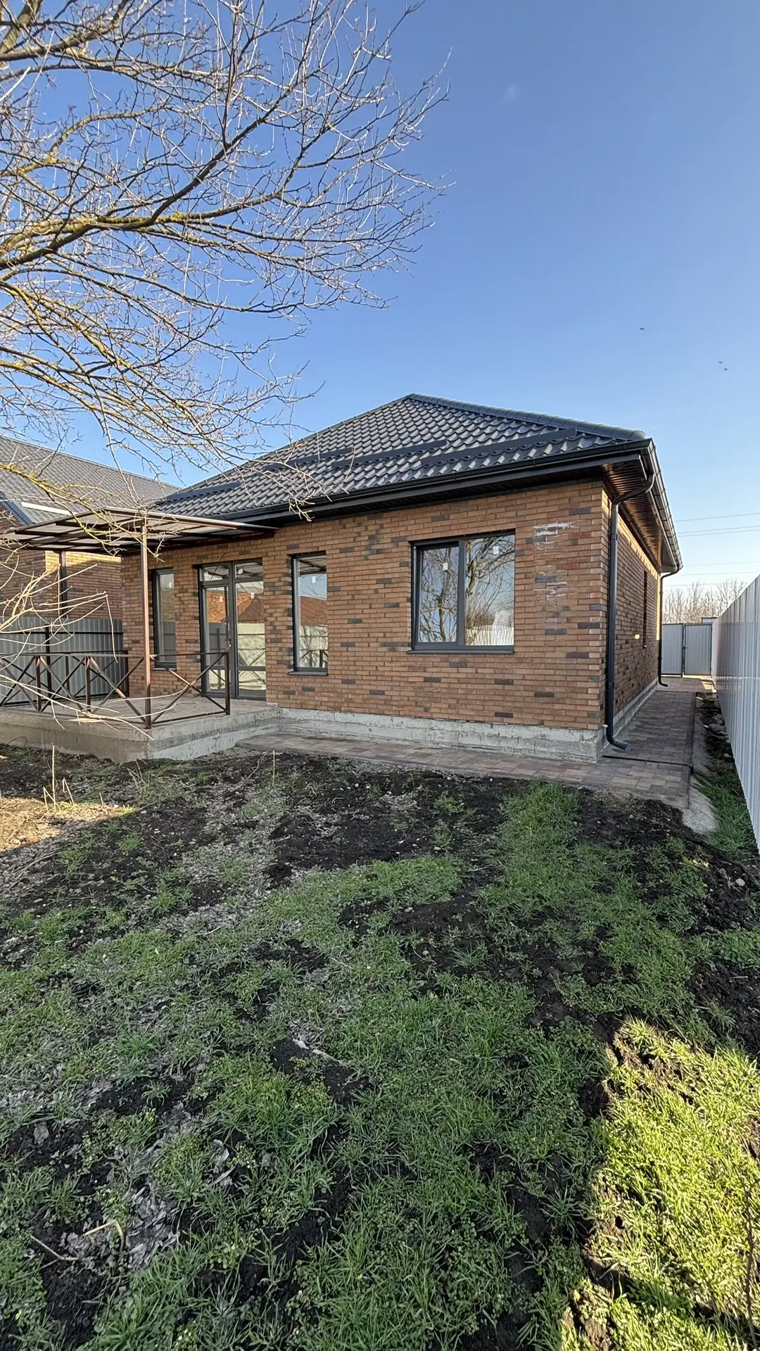 Земельный участок от 3 до 6 соток с назначением ИЖС, по периметру — забор из металлопрофиля, на въезде — автоматические ворота и калитка. На участке — бетонированная парковка, вокруг дома — отмостка.