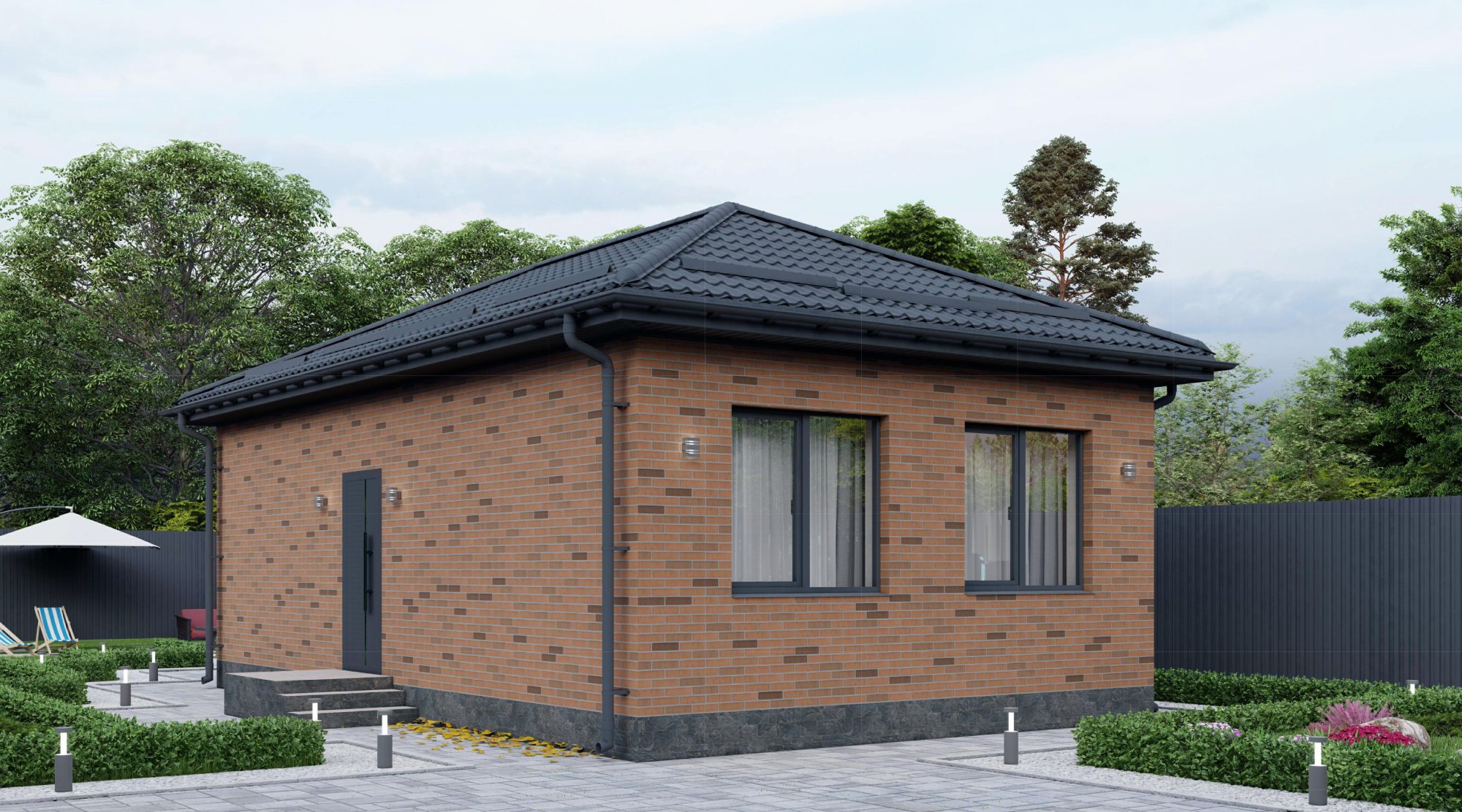 Земельный участок от 3 до 6 соток с назначением ИЖС, по периметру — забор из металлопрофиля, на въезде — автоматические ворота и калитка. На участке — бетонированная парковка, вокруг дома — отмостка.