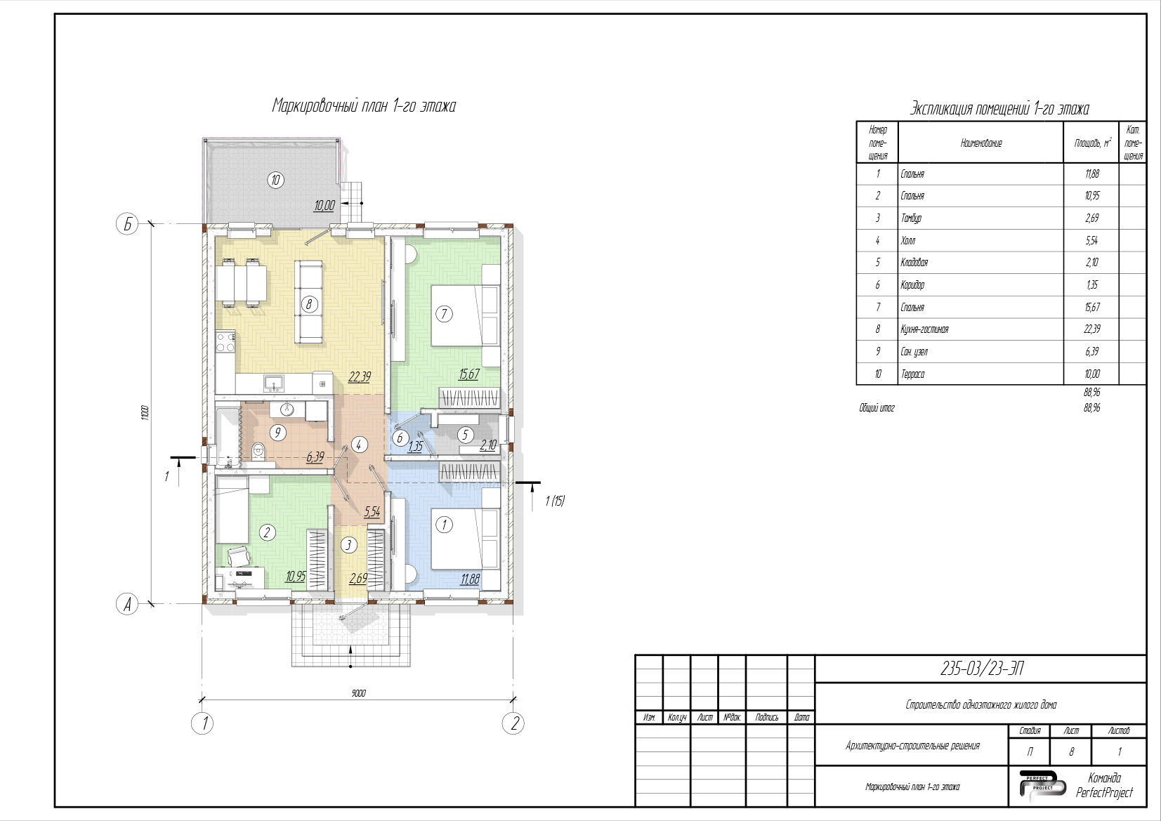 Общая площадь 100 кв. м., три изолированные спальни, гостиная, объединённая с кухней, два санузла. На заднем дворе — крытая терраса.