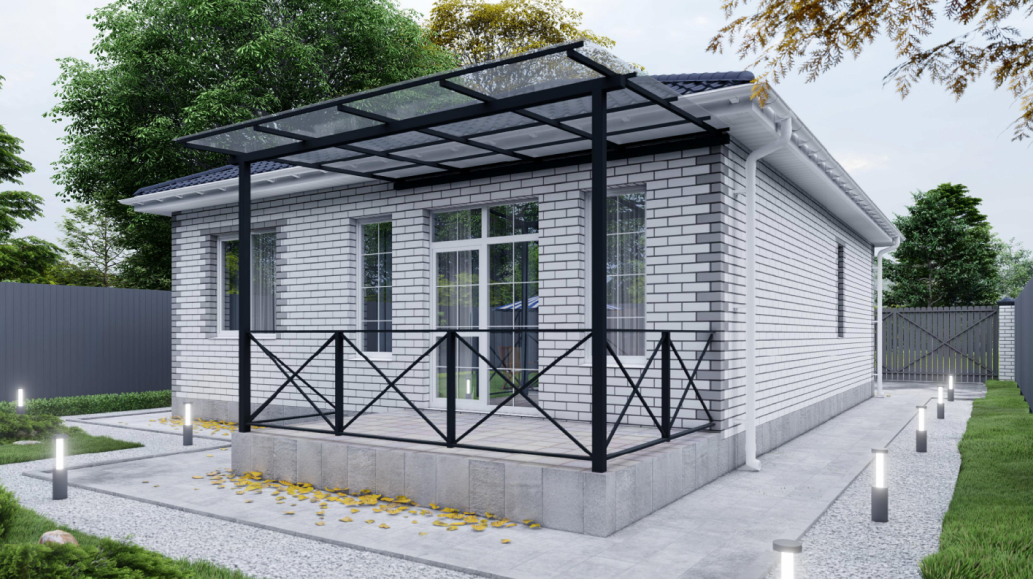 Земельный участок от 3 до 6 соток с назначением ИЖС, по периметру — забор из металлопрофиля, на въезде — автоматические ворота и калитка. На участке — бетонированная парковка, вокруг дома — отмостка.