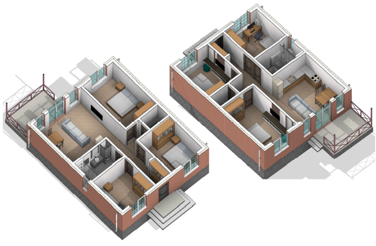 Описание: общая площадь 100 кв. м., три изолированные спальни, гостиная, объединённая с кухней, два санузла. На заднем дворе — крытая терраса.