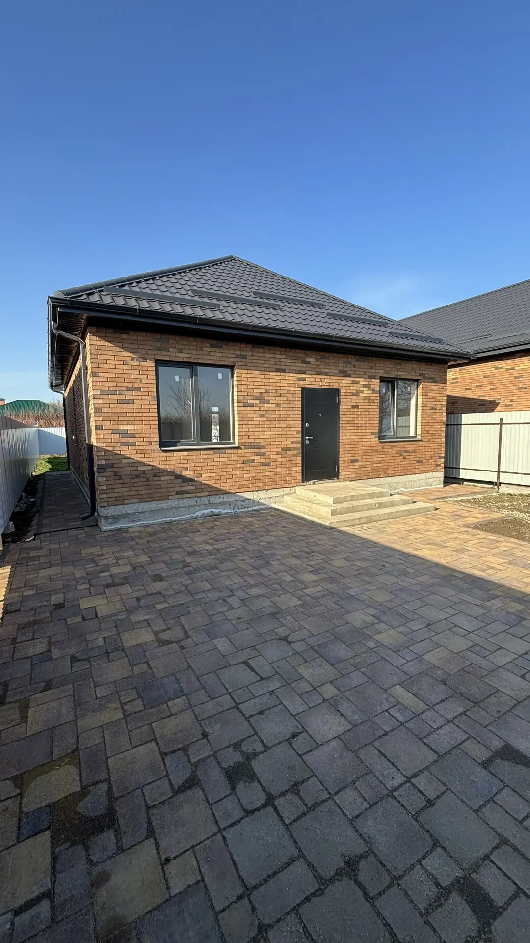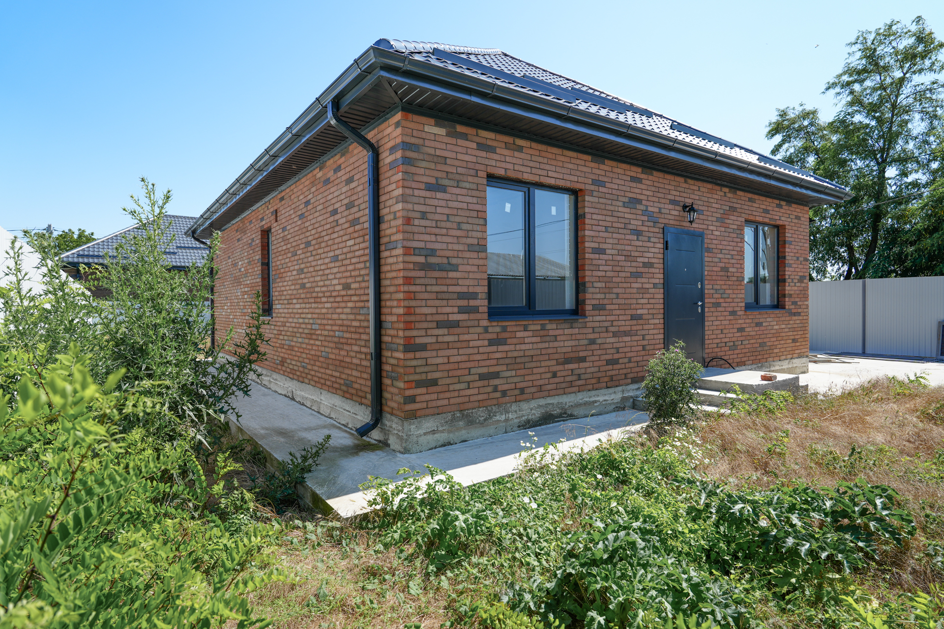 Земельный участок от 3 до 6 соток с назначением ИЖС, по периметру — забор из металлопрофиля, на въезде — автоматические ворота и калитка. На участке — бетонированная парковка, вокруг дома — отмостка.